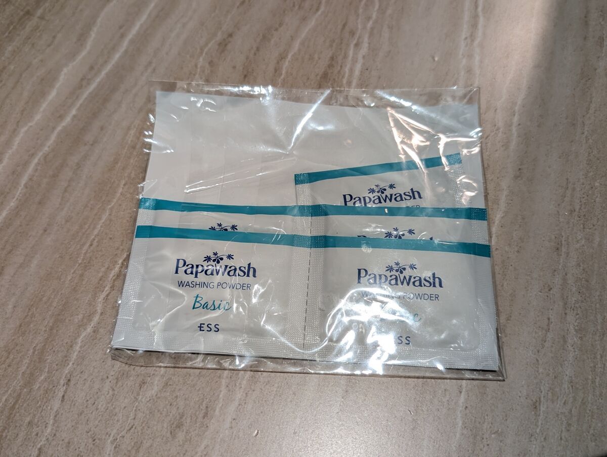 母にもらった洗顔のサンプル。今回の旅行で1個使った。2個組になってるので、半端な1個を更に消費。かさばるのでパッケージは処分。