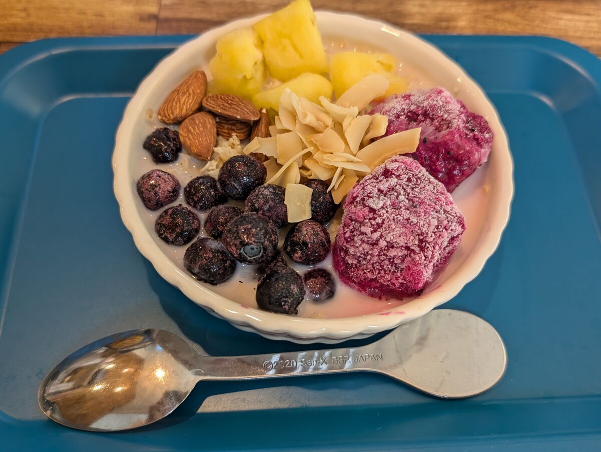 朝ご飯、オートミールを牛乳で米化してオーツミルクとフルーツとアーモンドとココナッツをトッピングしたやつ。オーバーナイトオーツ作れなかった日はこれでもいいかも。