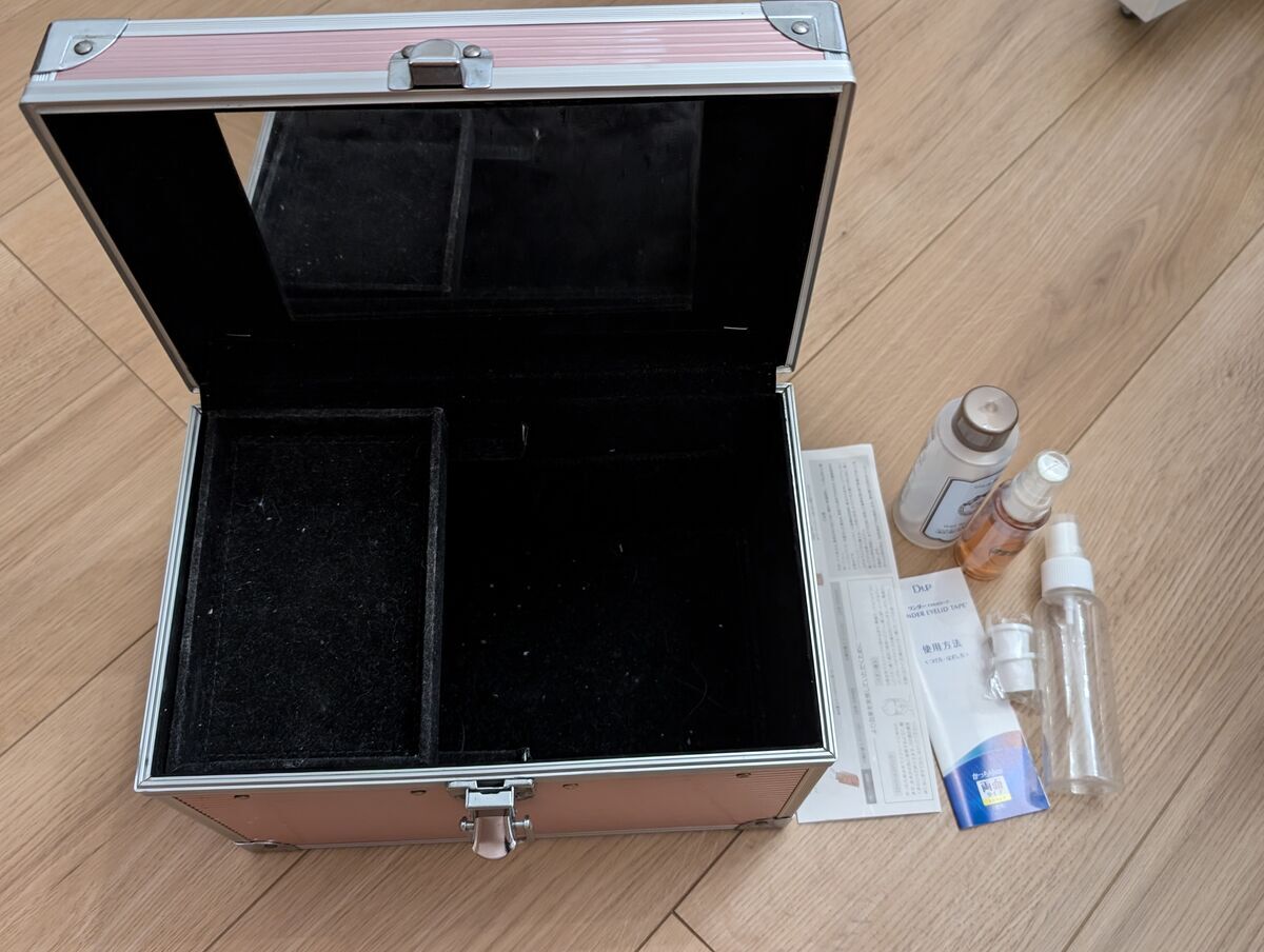 使わなくなって、コスメの説明書やウィッグ用のトリートメント、除光液を入れてた。除光液がこぼれたのか匂いが充満していて、もう使えそうにないので処分。金属ごみ。