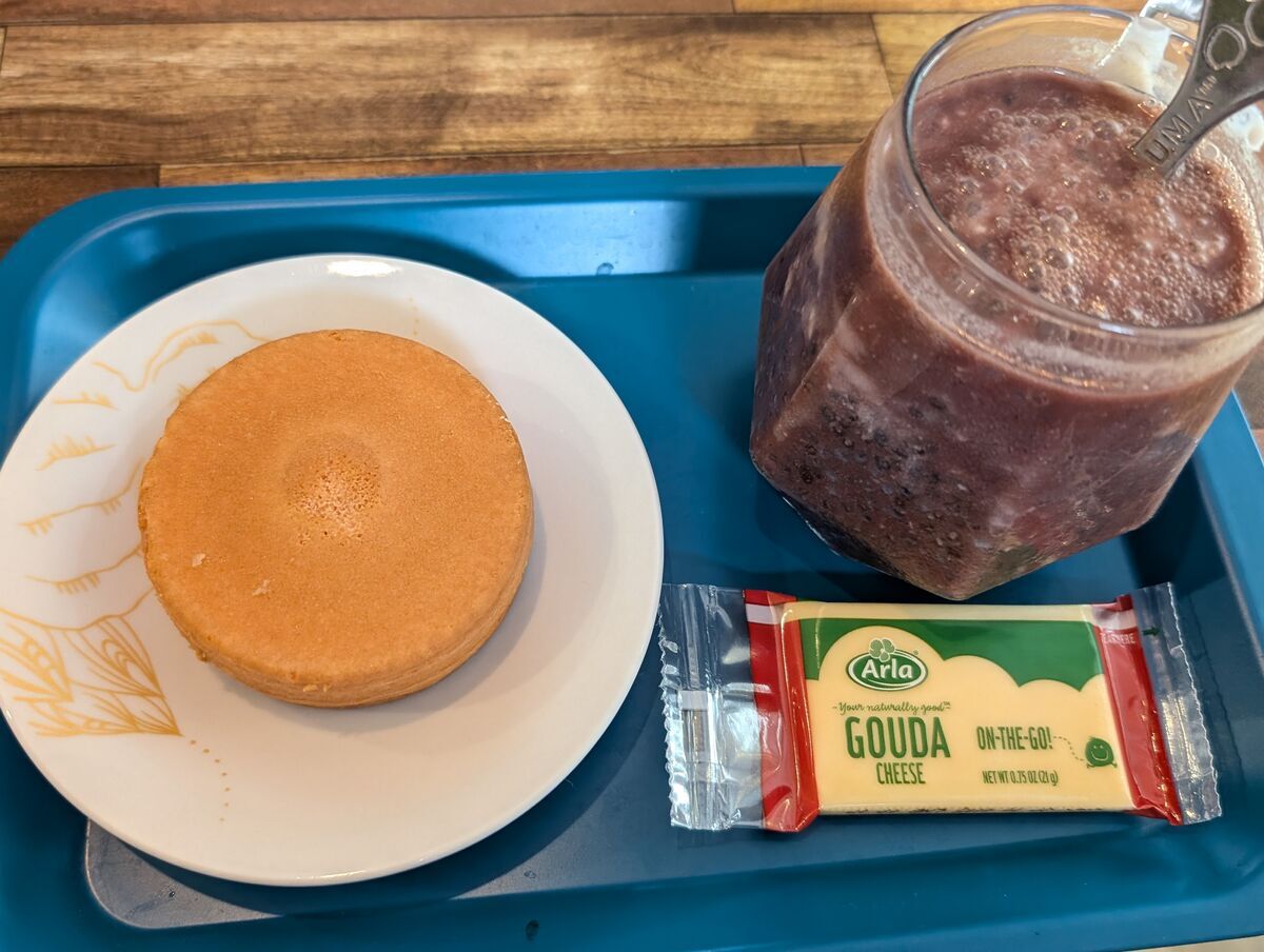 朝ご飯、冷凍のいちごミルク今川焼、ゴーダチーズ、アサイージュース(チアシード、バジルシード、無脂肪ヨーグルト)