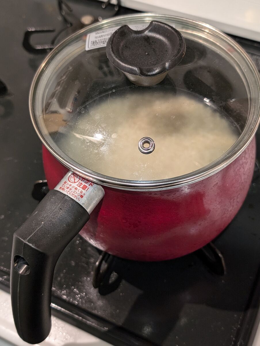 沸騰後12分加熱するも、火加減が弱くて水っぽい仕上がりになったので、3分追加で加熱したらちょうど良くなった。