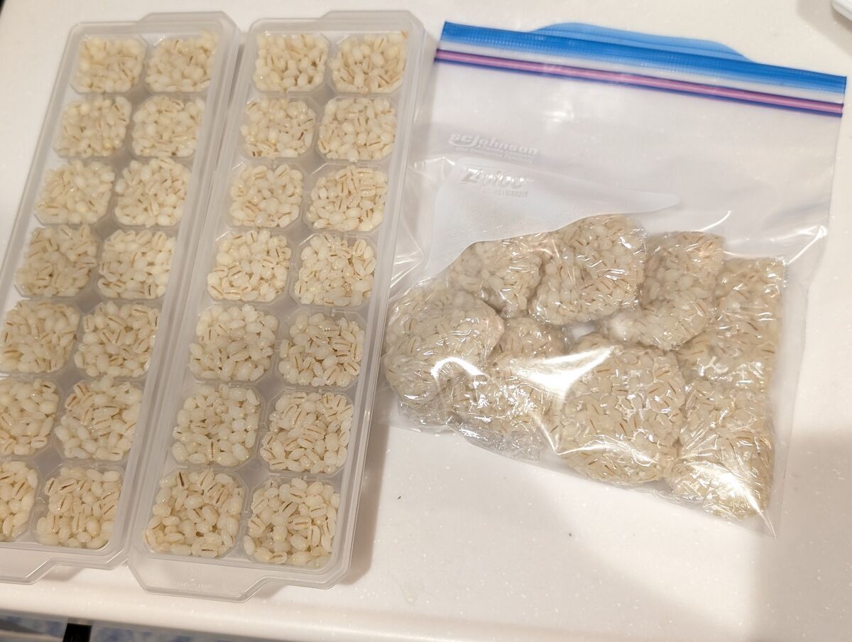 このまま冷凍。使う時は1個ずつ30秒くらいレンチンしてご飯に乗せるだけで気軽にもち麦ごはんが食べられる。