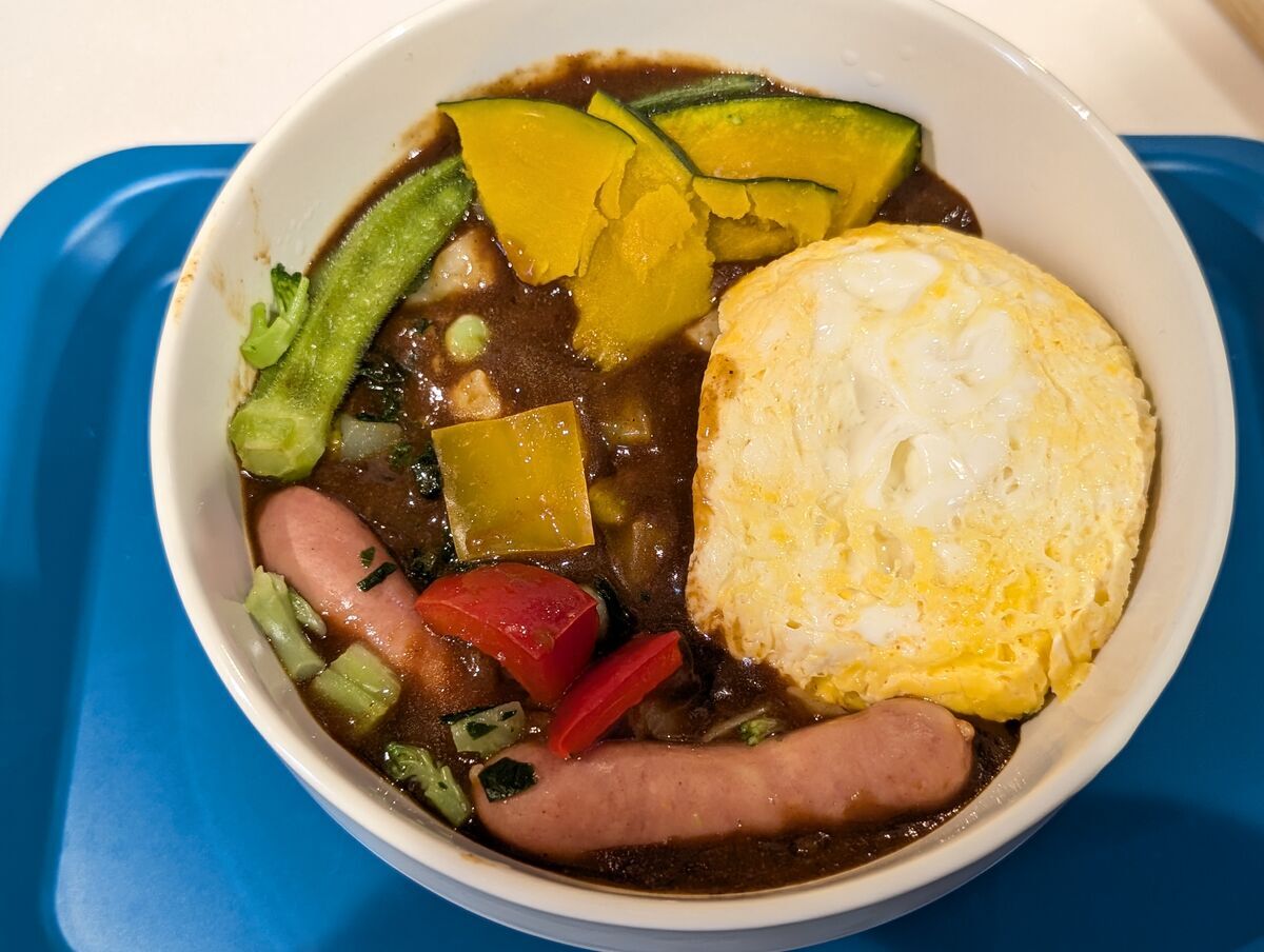 朝ご飯のたんぱく質が足りなくて、その後もシーフードカレーだったり米も少なかったりしたので満足感が得られにくい食事だった。