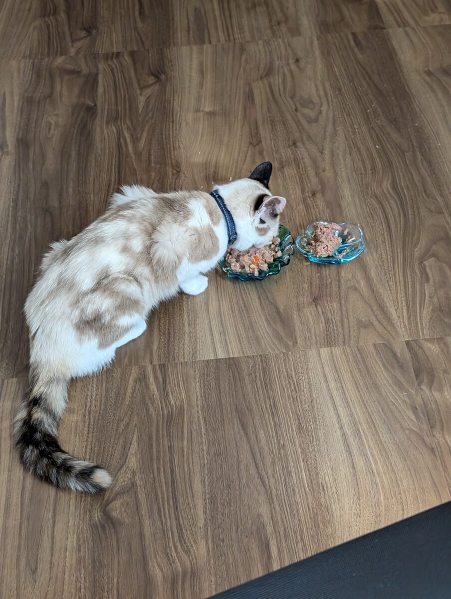 猫はケーキ代わりにパテのフードを買ってあげたけど、食べ慣れないのか最初は1匹しか食べなくて、鰹節と砕いた煮干しをかけたら全員食べてくれた。