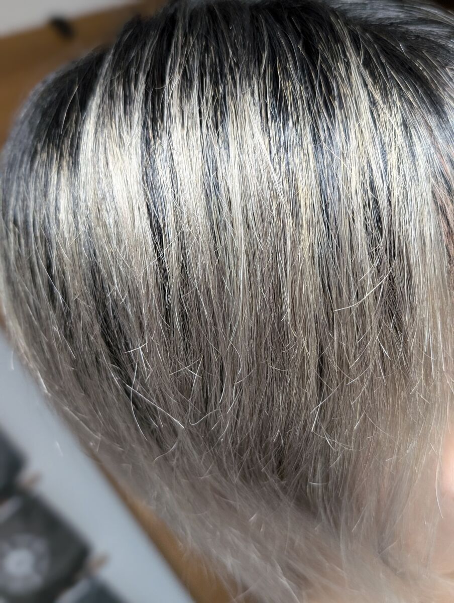 私は髪色は自分でブリーチ、カラーシャンプーでシルバーを維持していたけど、リタッチ期間が空きすぎて根元プリンが限界になっていた。